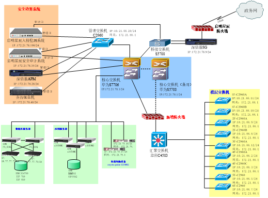 2) 把目前闲置的思科C4503交换机作为汇聚层设备,所有楼层交换机先汇聚到C4503,然后经过防火墙再上联到华为S7706核心交换机。